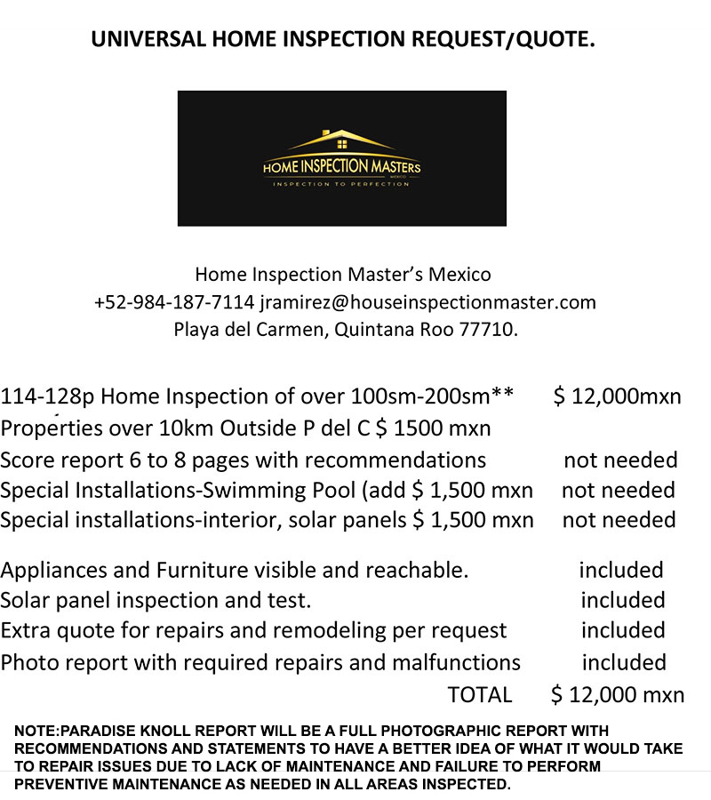 We are Home Inspector Master Mexico with over 8 years of experience in Quintana Roo. Our qualified team is composed by 3 highly knowledgeable specialized estructural engineers and 2 general contractors licensed and experienced in us coding regulations.